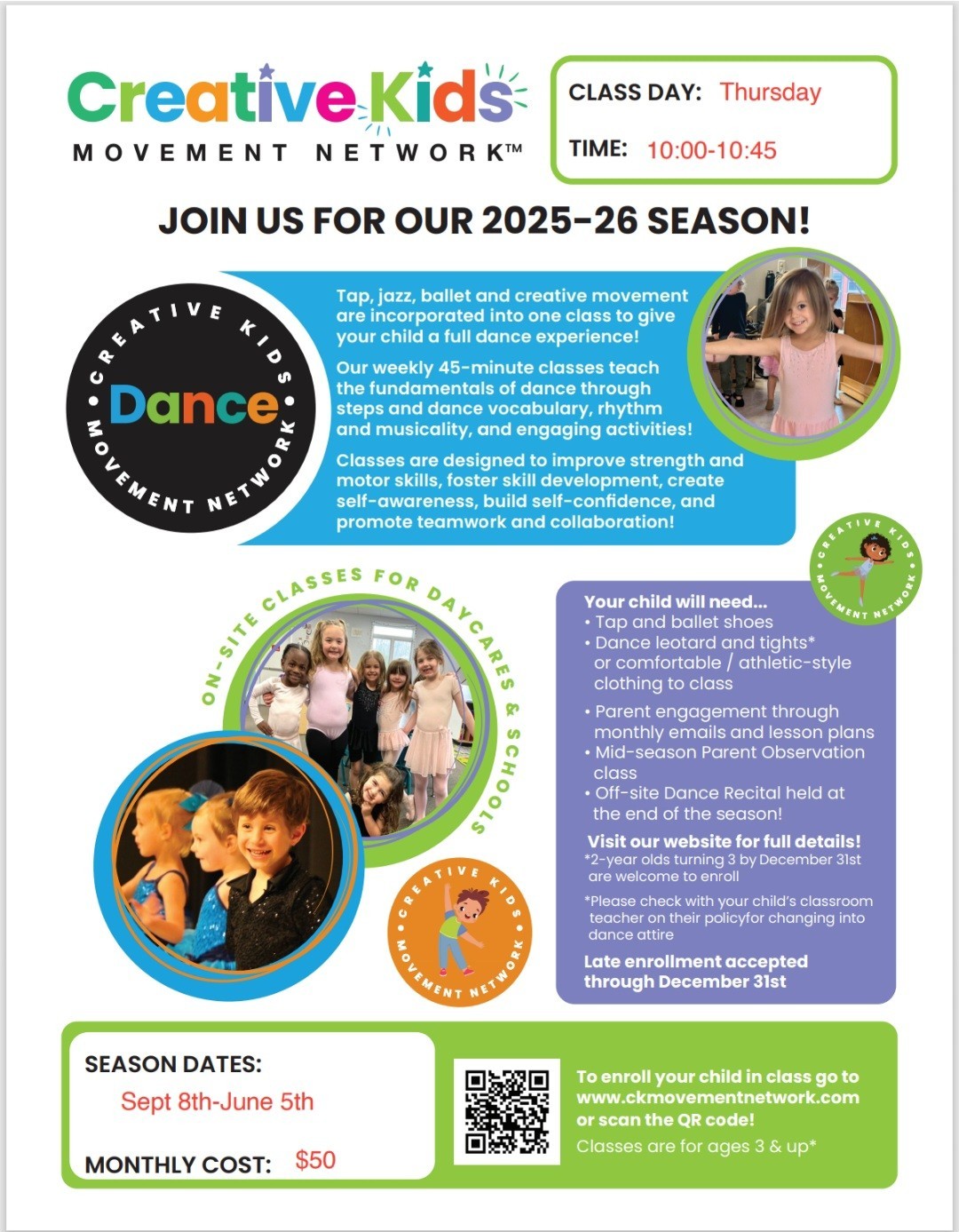 Each weekly class is 30-45 minutes long and designed to strengthen motor skills, build self-confidence, foster creativity, and promote teamwork. Classes are taught by experienced Creative Kids instructors who make learning active and engaging.
